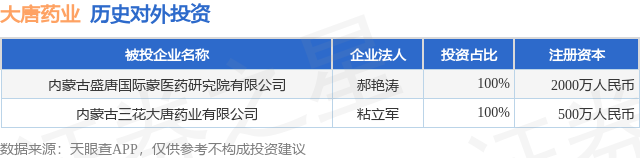 本站消息,根据天眼查APP显示,大唐药业(920433.BJ)新增一起对外投资事件,被投资公司为内蒙古盛唐国际蒙医药研究院有限公司擒牛宝,法定代表人郝艳涛,投资占比为100%。该公司从事研究和试验发展擒牛宝,注册资本为2000万人民币。目前,大唐药业共存在对外投资2项,详见下表: